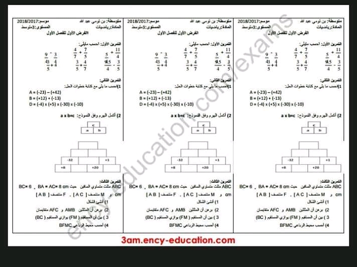 الفرض الاول للثلاثي 1 في مادة الرياضيات سنة 3 متوسط 2017-2018 – متوسطة بن ثومي عبد الله: