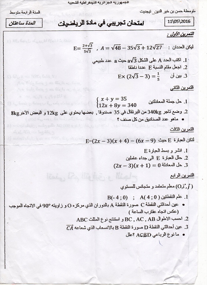 امتحان تجريبي في الرياضيات 2015-2016 – ثانوية حسن بن خير الدين: