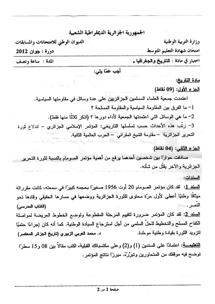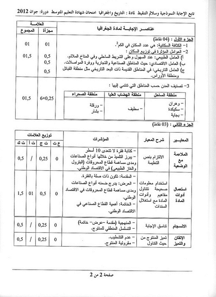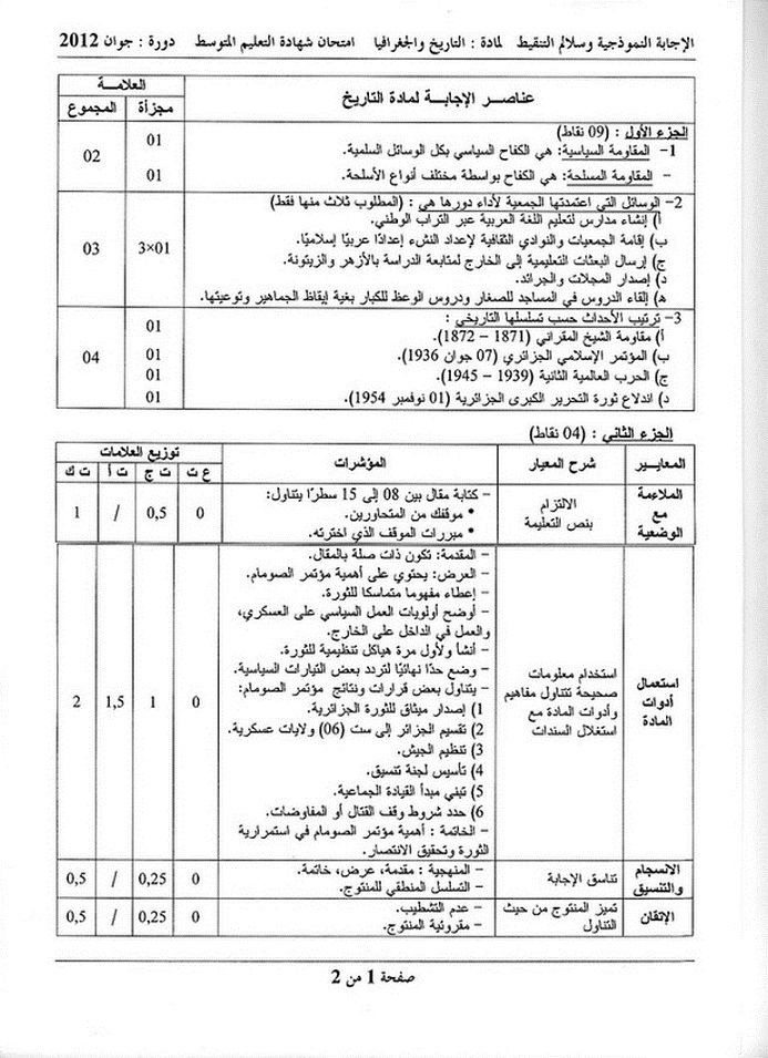 موضوع + التصحيح النموذجي في التاريخ و الجغرافيا شهادة التعليم المتوسط 2012: