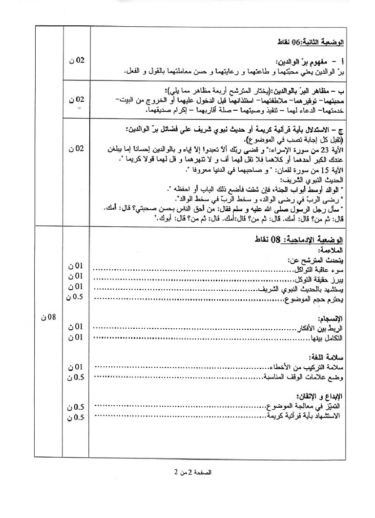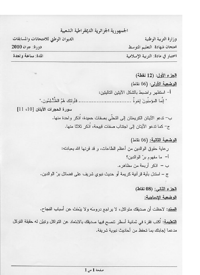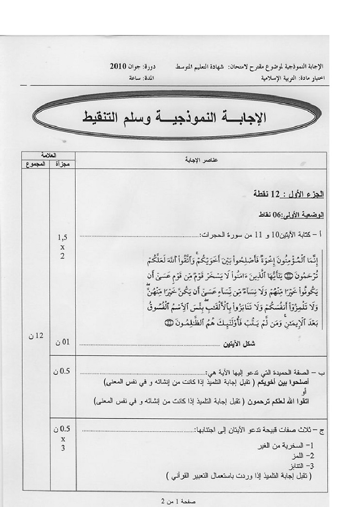 موضوع + التصحيح النموذجي في التربية الاسلامية شهادة التعليم المتوسط 2010 موضوع + التصحيح النموذجي في التربية الاسلامية شهادة التعليم المتوسط 2010: