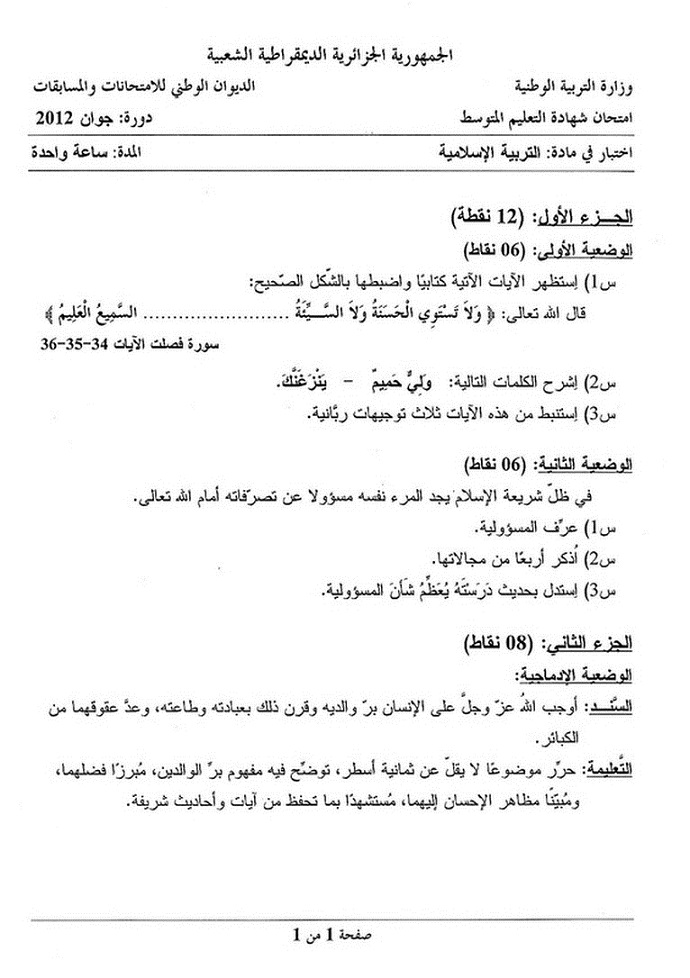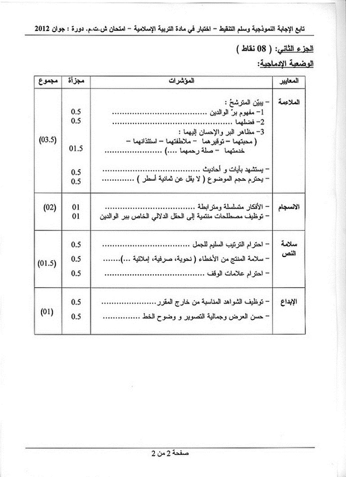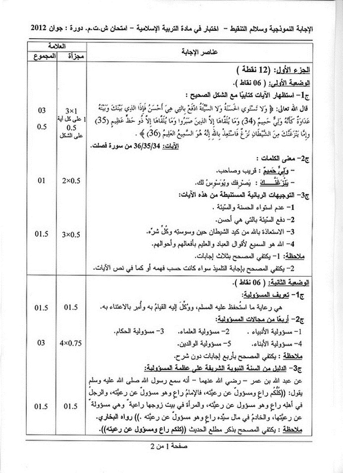 موضوع + التصحيح النموذجي في التربية الاسلامية شهادة التعليم المتوسط 2012 موضوع + التصحيح النموذجي في التربية الاسلامية شهادة التعليم المتوسط 2012: