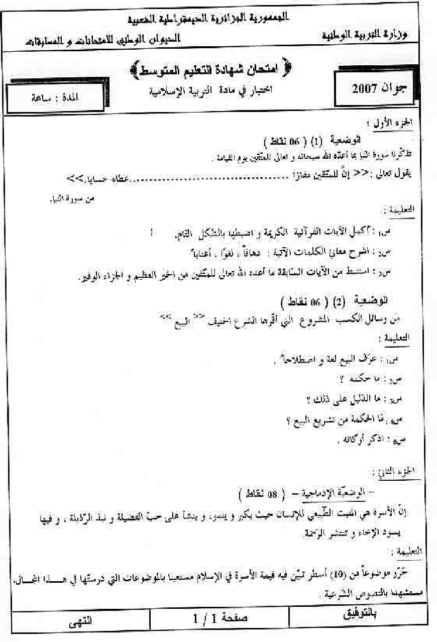 موضوع + التصحيح النموذجي في التربية الاسلامية شهادة التعليم المتوسط 2007 موضوع + التصحيح النموذجي في التربية الاسلامية شهادة التعليم المتوسط 2007: