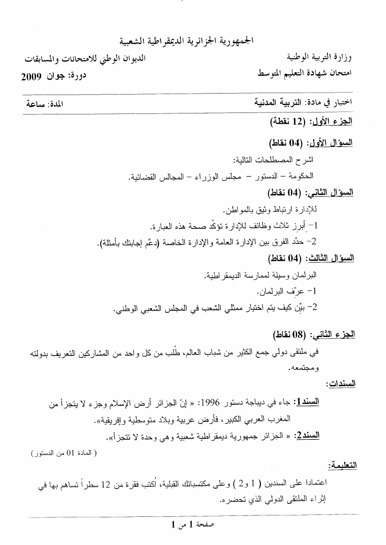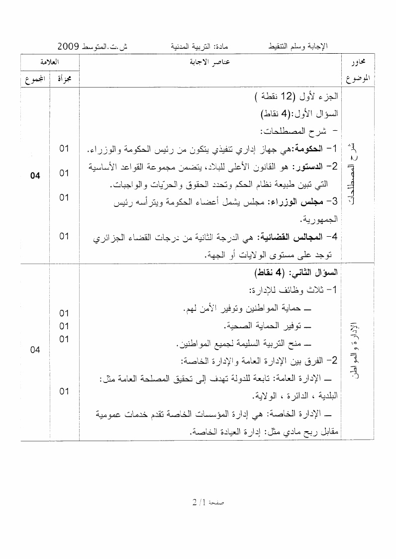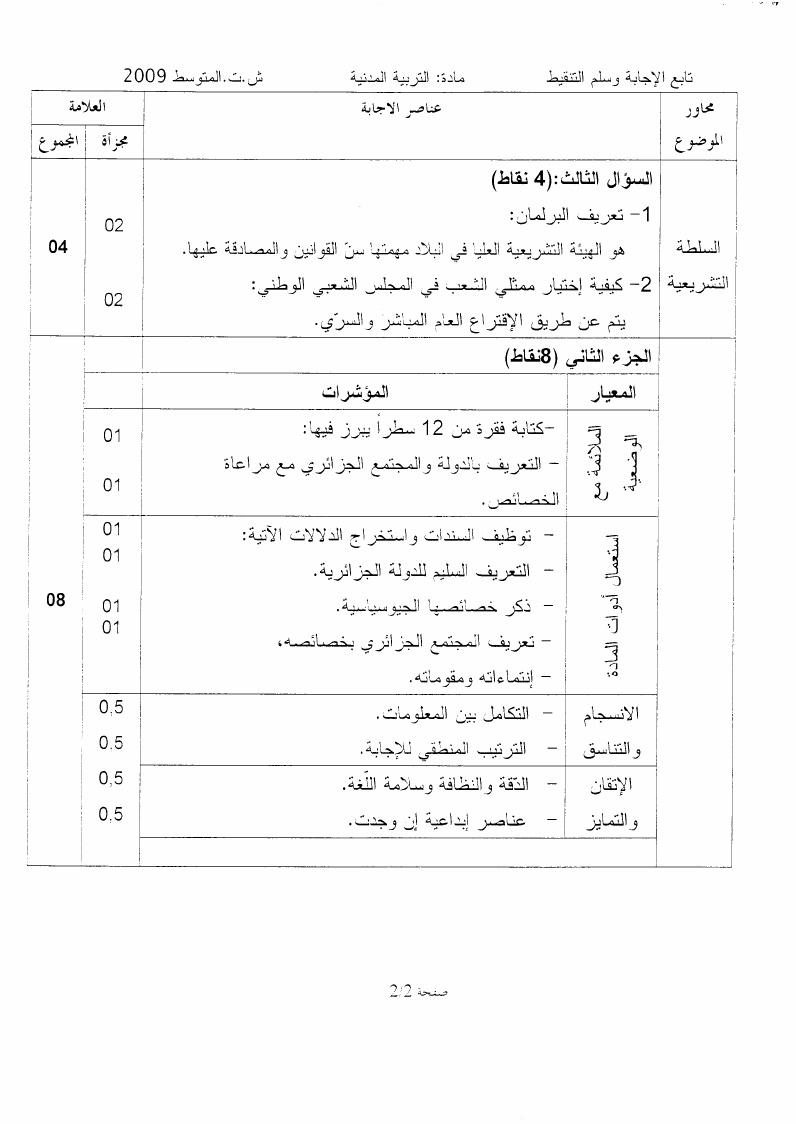 موضوع + التصحيح النموذجي في التربية المدنية شهادة التعليم المتوسط 2009