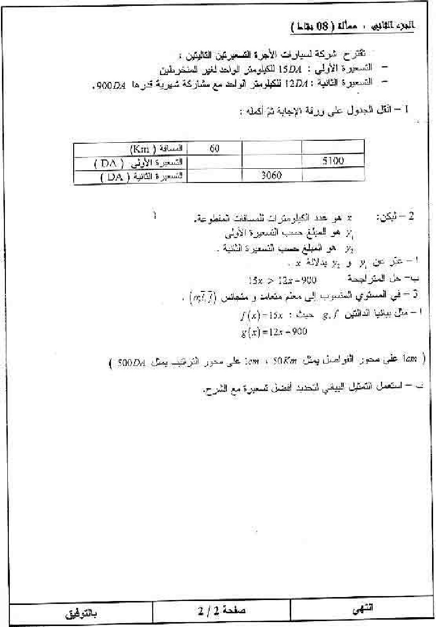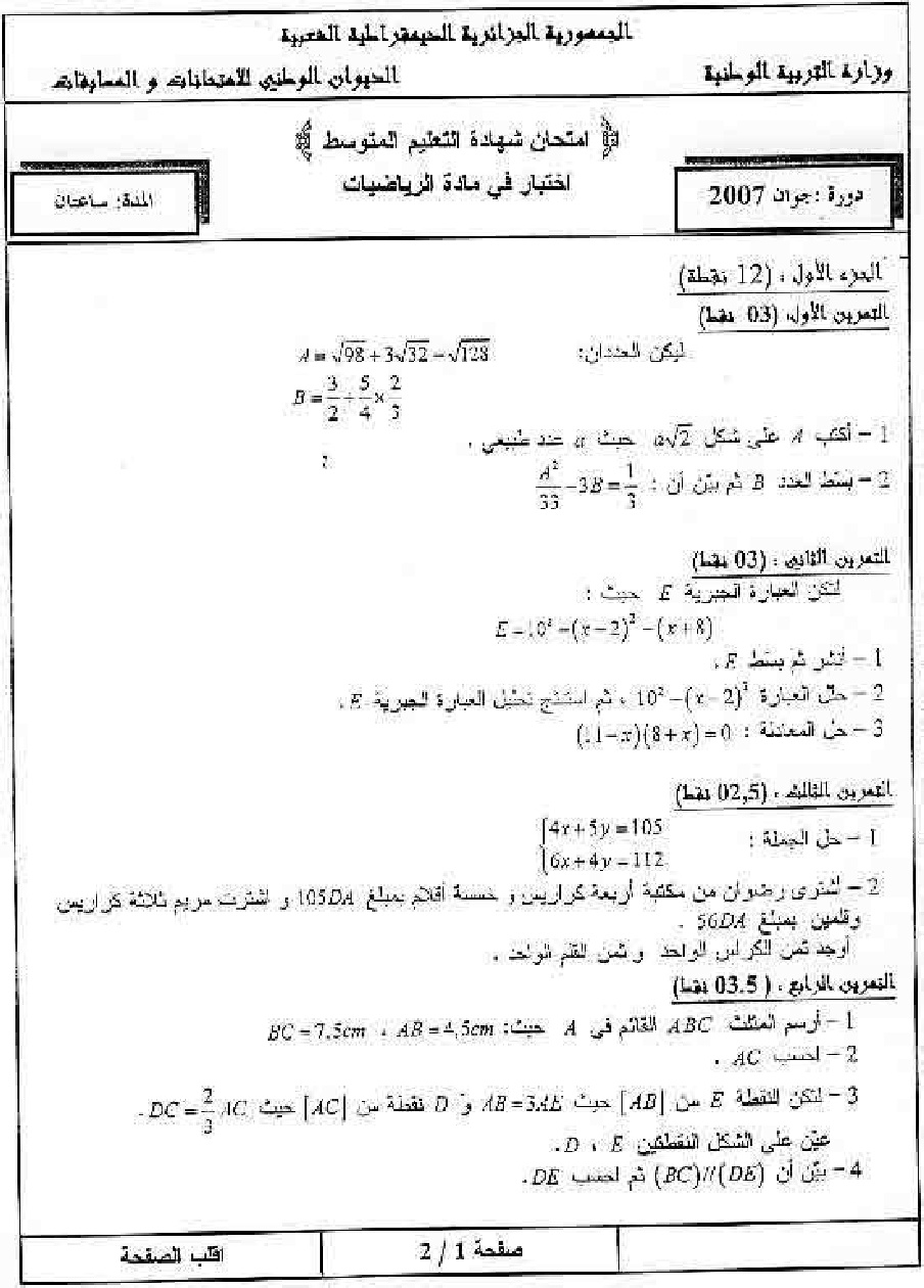 موضوع + التصحيح النموذجي في الرياضيات شهادة التعليم المتوسط 2007 موضوع + التصحيح النموذجي في الرياضيات شهادة التعليم المتوسط 2007: